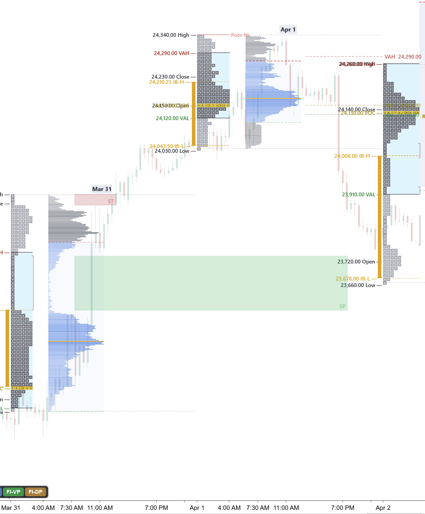 When April 1 opened, it gapped above the March 31 value area. The green shaded zone shows the single printDefinitionPrice levels with only one TPO letter — price moved through quickly. Often act as support or resistance. area from the prior session. Price respected it perfectly — the gap held, and the rally continued without ever filling back into those single prints.