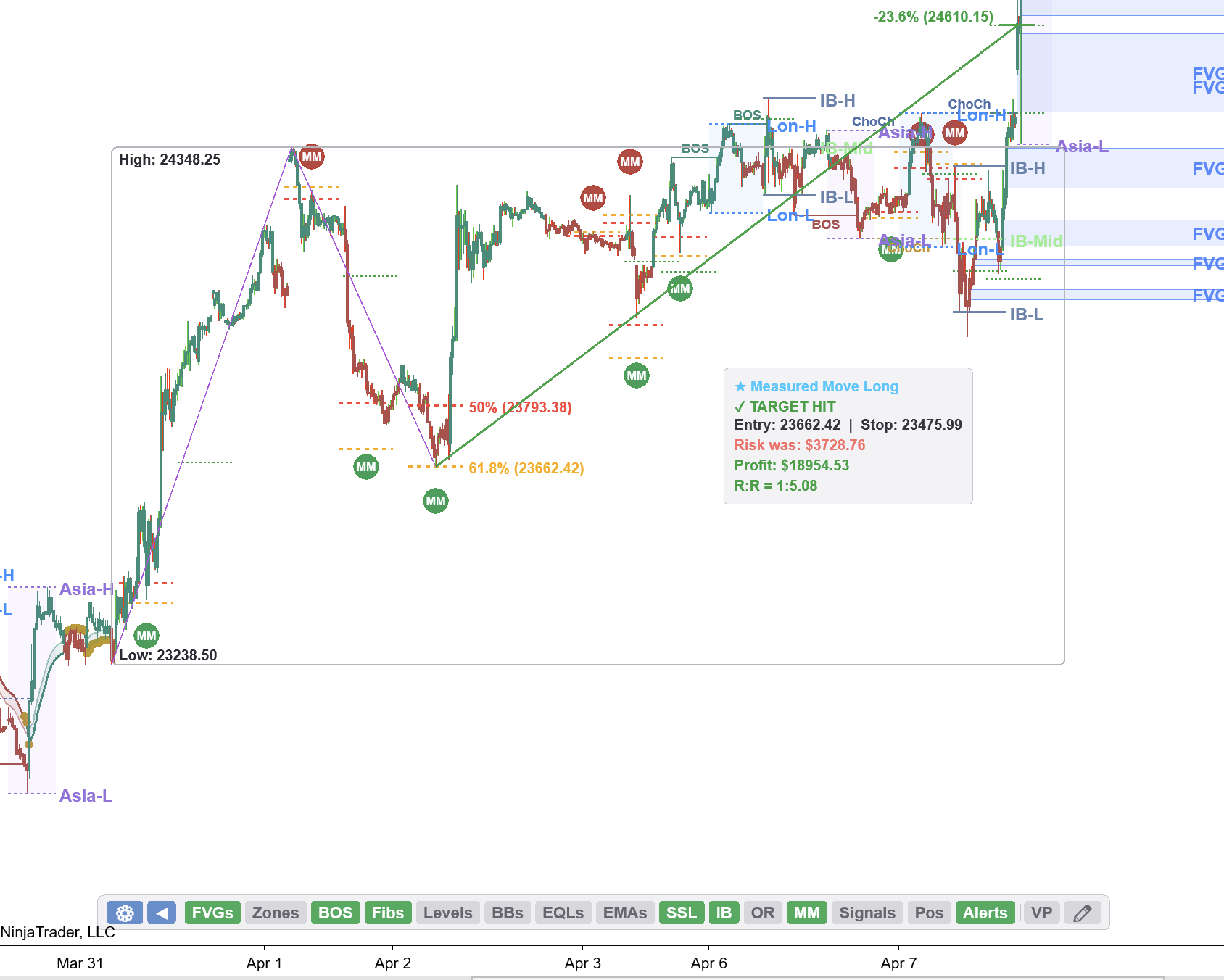 The indicator flagged this as a Measured MoveDefinitionA price projection where Leg B equals Leg A. Primary target is the -23.6% extension beyond 100%. Long with an entry at 23,862, a stop at 23,475, and a target at the -23.6% extension at 24,610. The result: target hit, 1:5 risk-to-reward, and a profit of nearly $19,000 on a single measured move signal.