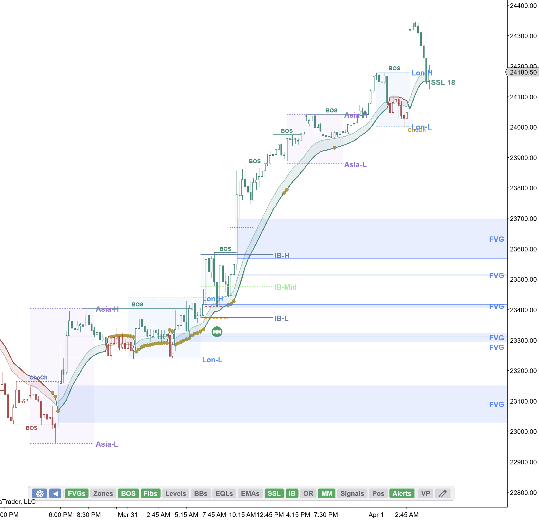 The first week of April 2026 delivered one of the cleanest structural rallies we have seen on NQ in months. From the March 31 low near 22,900 to the April 7 highs above 24,600, every leg of this move printed textbook market structure — BOSDefinitionBreak of Structure — price breaks the previous swing point in the trend direction. Confirms continuation. after BOS, clean measured moveDefinitionA price projection where Leg B equals Leg A. Primary target is the -23.6% extension beyond 100%. targets, and market profile confirmations that gave traders multiple entries along the way.