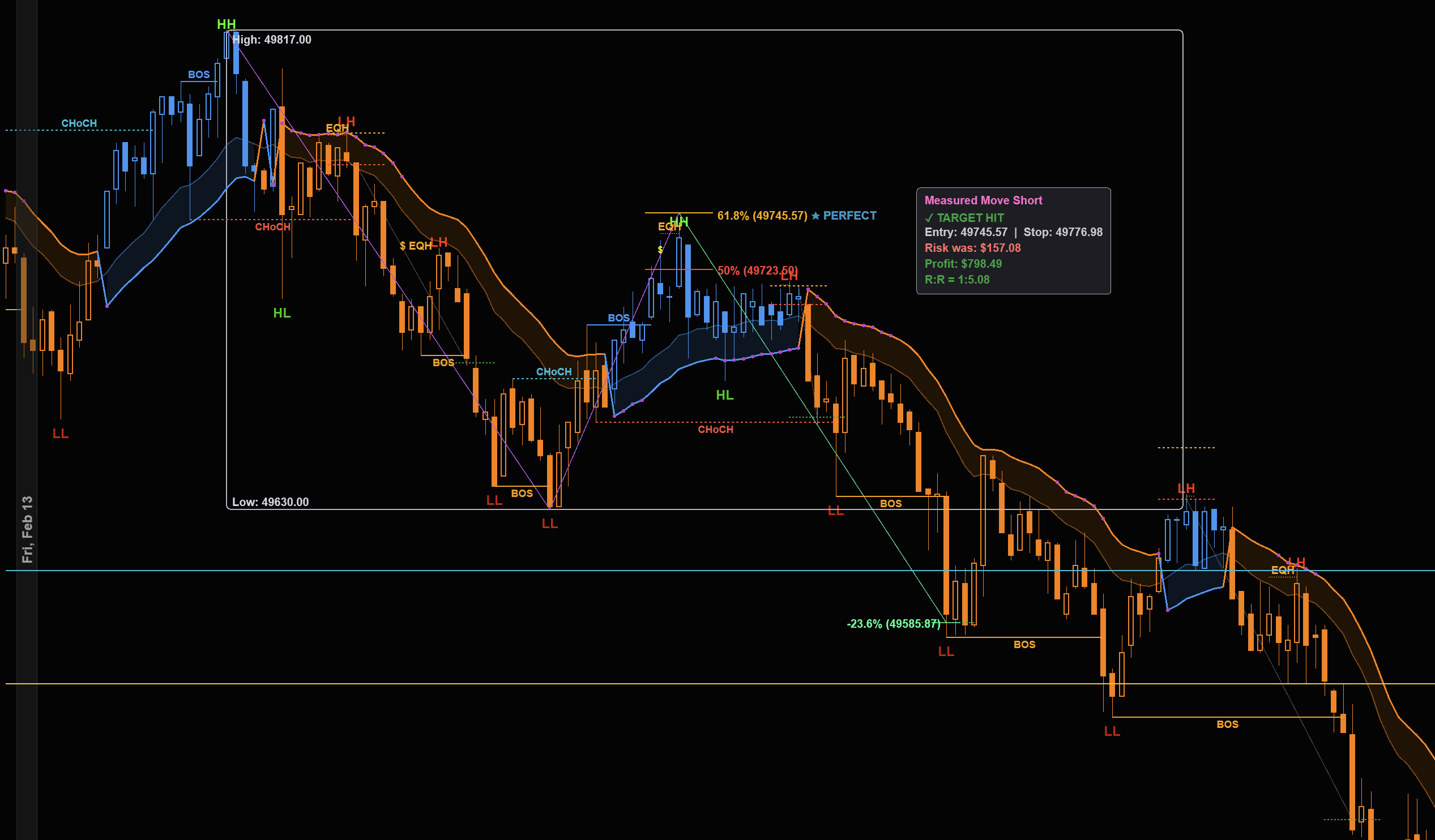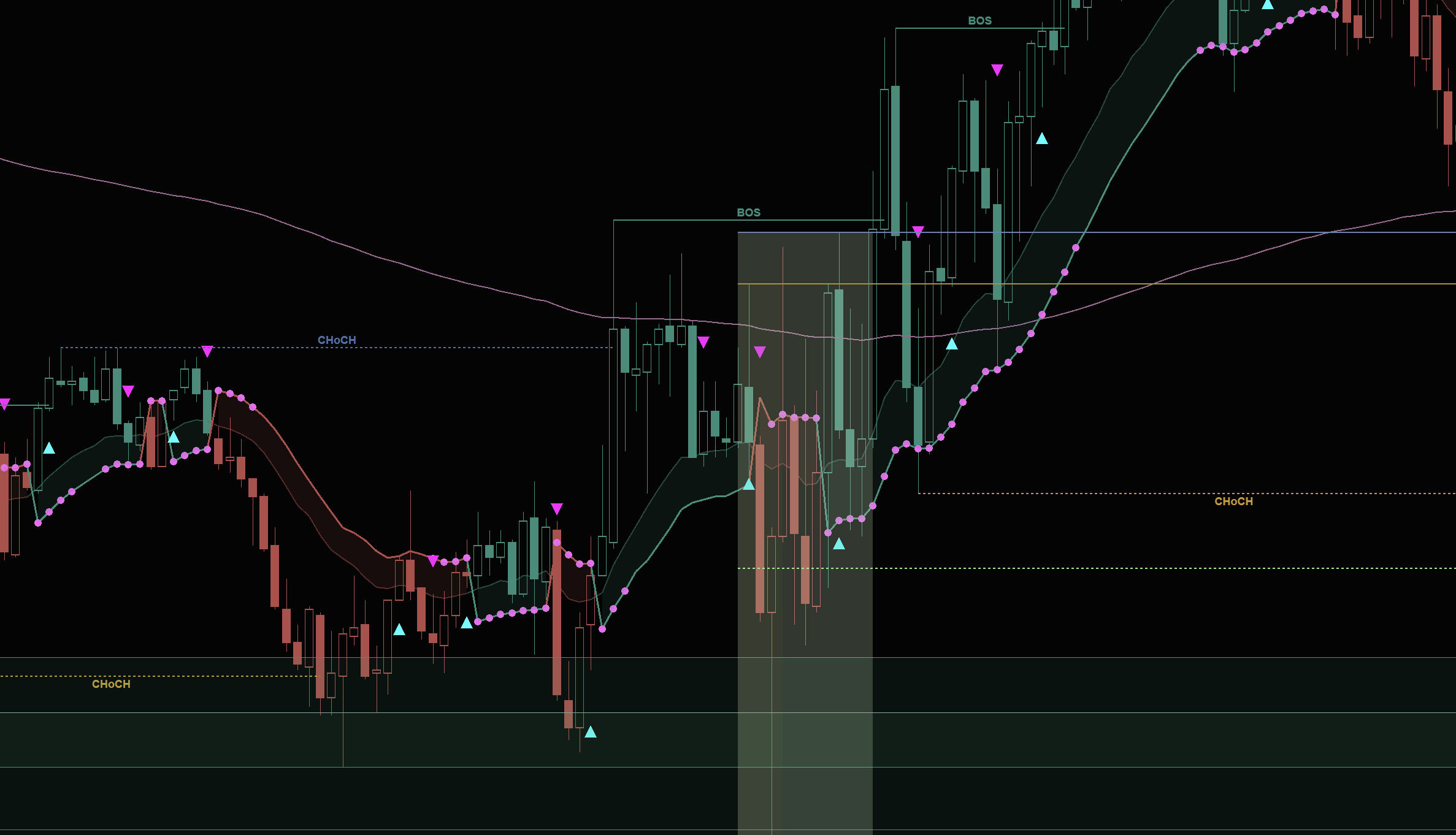 Here is a real example of how this plays out on the ES chart. Notice how the CHoCH and BOS labels identify the structure shift, and then price trends cleanly with the SSL Cloud confirming direction: