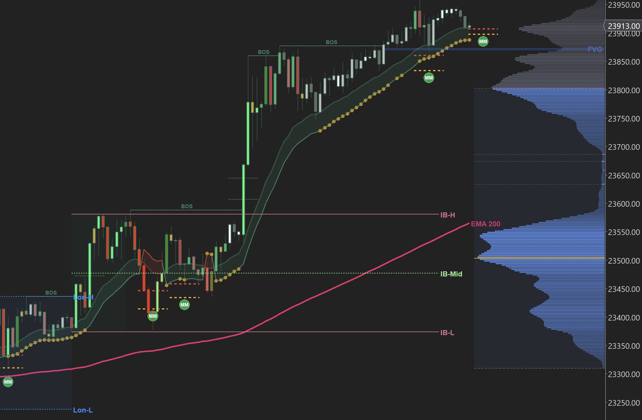 Our Market Structure Indicator automatically plots IB HighDefinitionHighest price of the Initial Balance. Acts as resistance. A break above = range extension. and IB Low levels on your NinjaTrader chart, while the OrderFlow Indicator gives you the volume profile and footprint data to confirm entries at these levels. Together, they show you exactly where the key levels are and what is happening when price gets there.