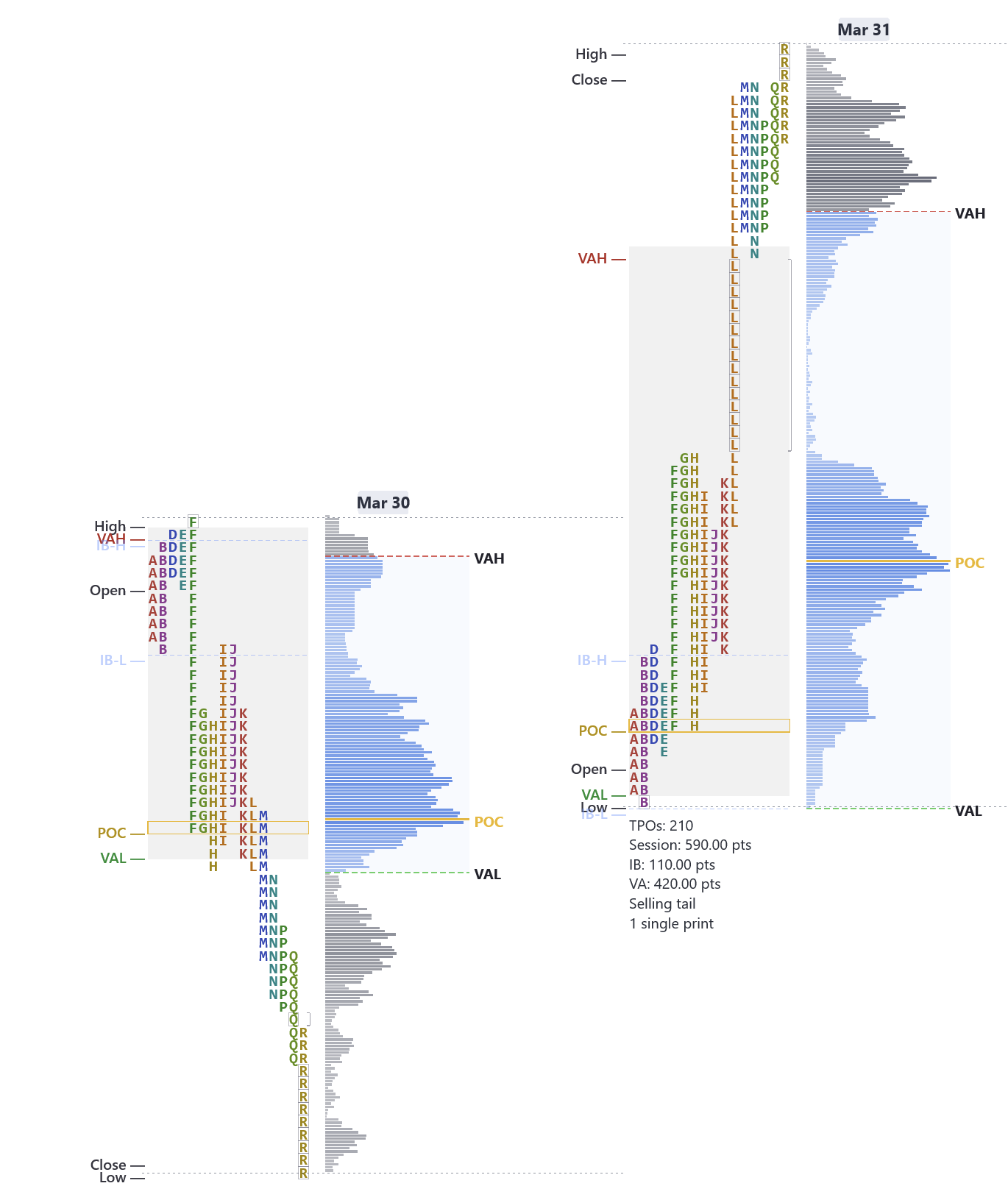 - If the market fills the single printsDefinitionPrice levels with only one TPO letter — price moved through quickly. Often act as support or resistance on retest. (spends time there), the prior initiative move is being unwound