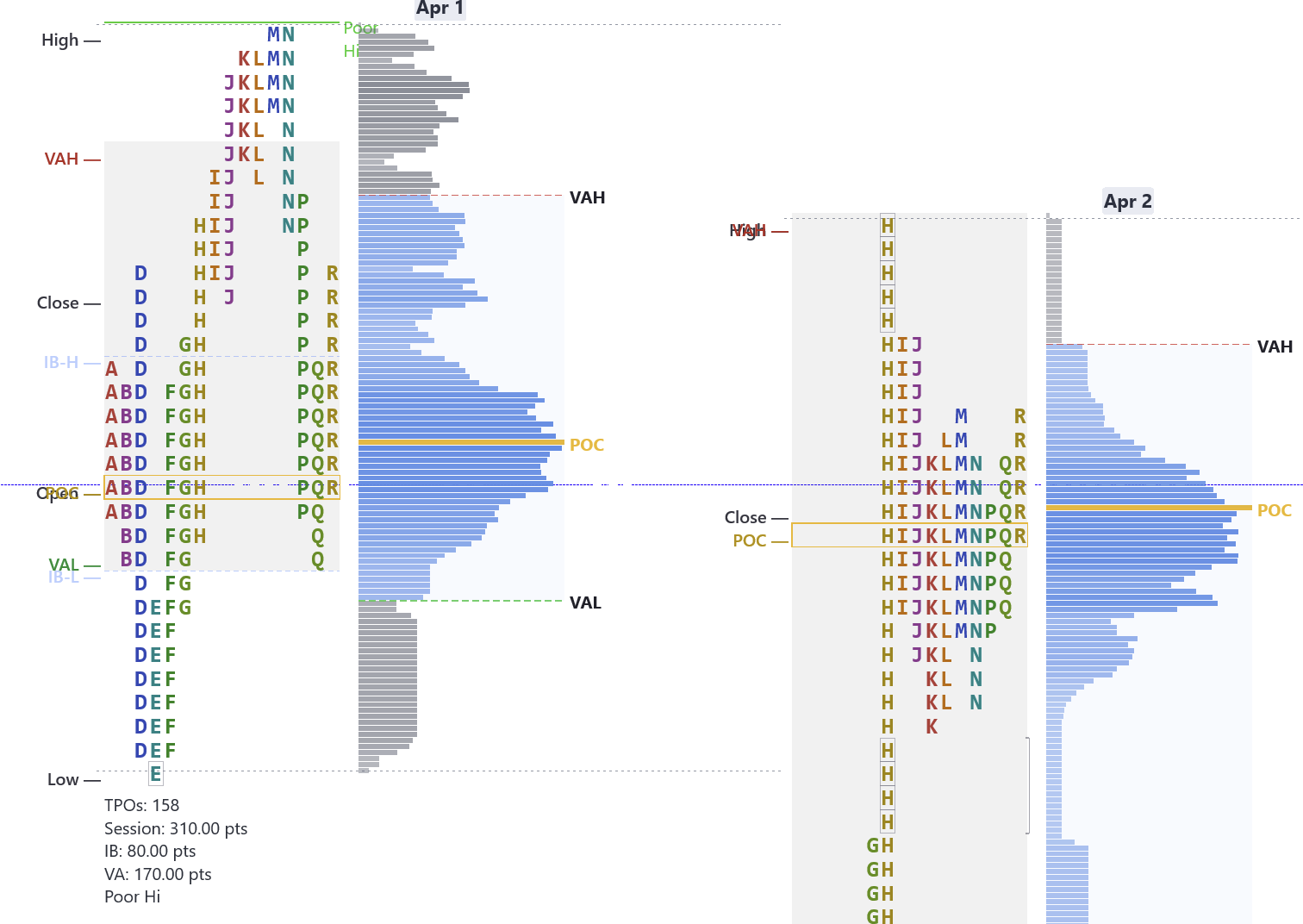 - Profile gives you the levels — prior POCDefinitionPoint of Control — the price with the highest volume. Where the most trading happened., VAHDefinitionValue Area High — the upper boundary of the zone where 70% of volume traded., VAL, single printsDefinitionPrice levels with only one TPO letter — price moved through quickly. Often act as support or resistance on retest., poor highs and lows